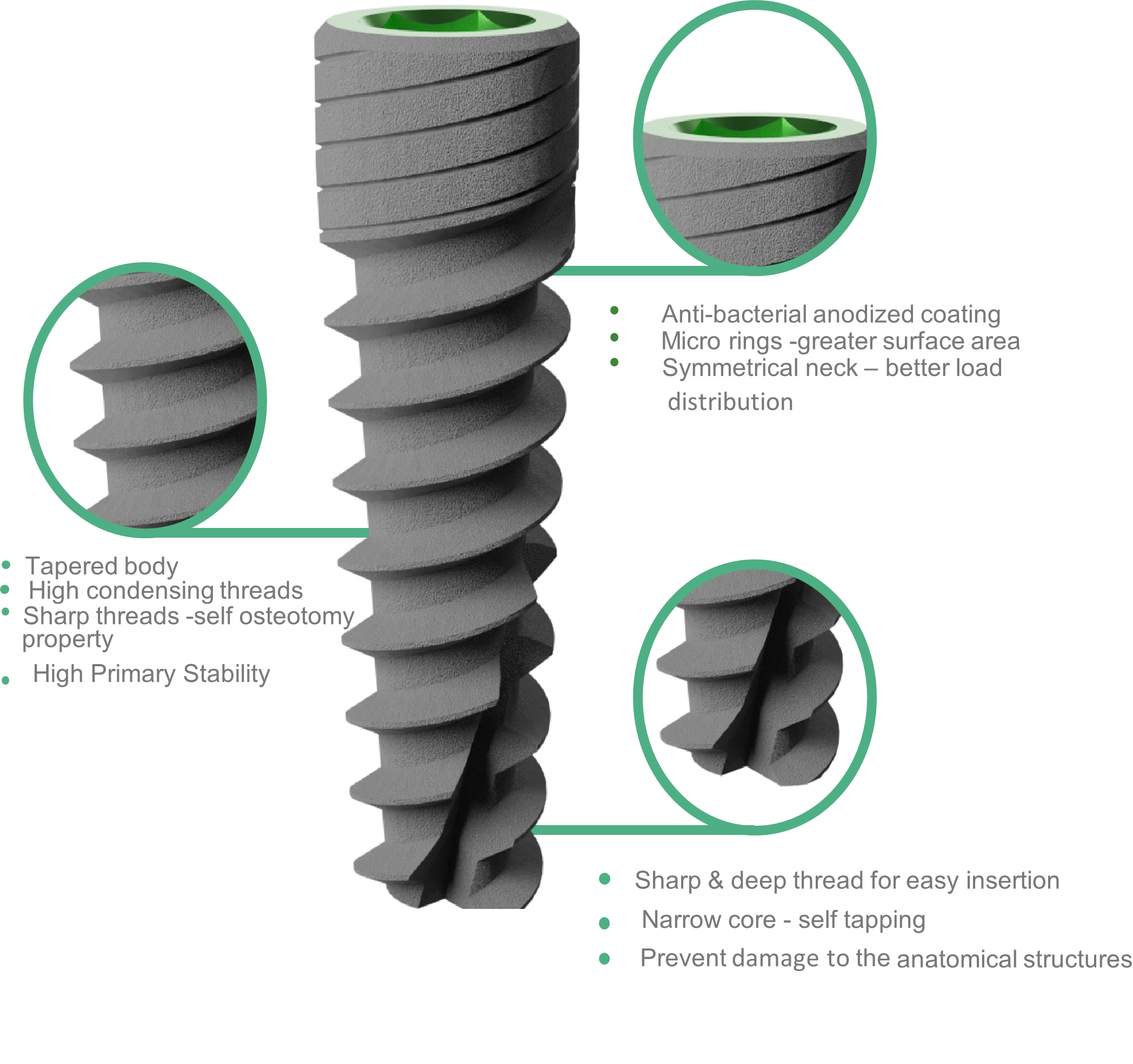 The SPIRAL implant is one of the most widely used implants by GreenAlphaTech's customers around the world, as being a legacy dental solution for a variety of clinical indications with decades of proven clinical successes. It is a tapered internal hex Connection (IHC) implant, and is available in a wide range of implant diameters & lengths.