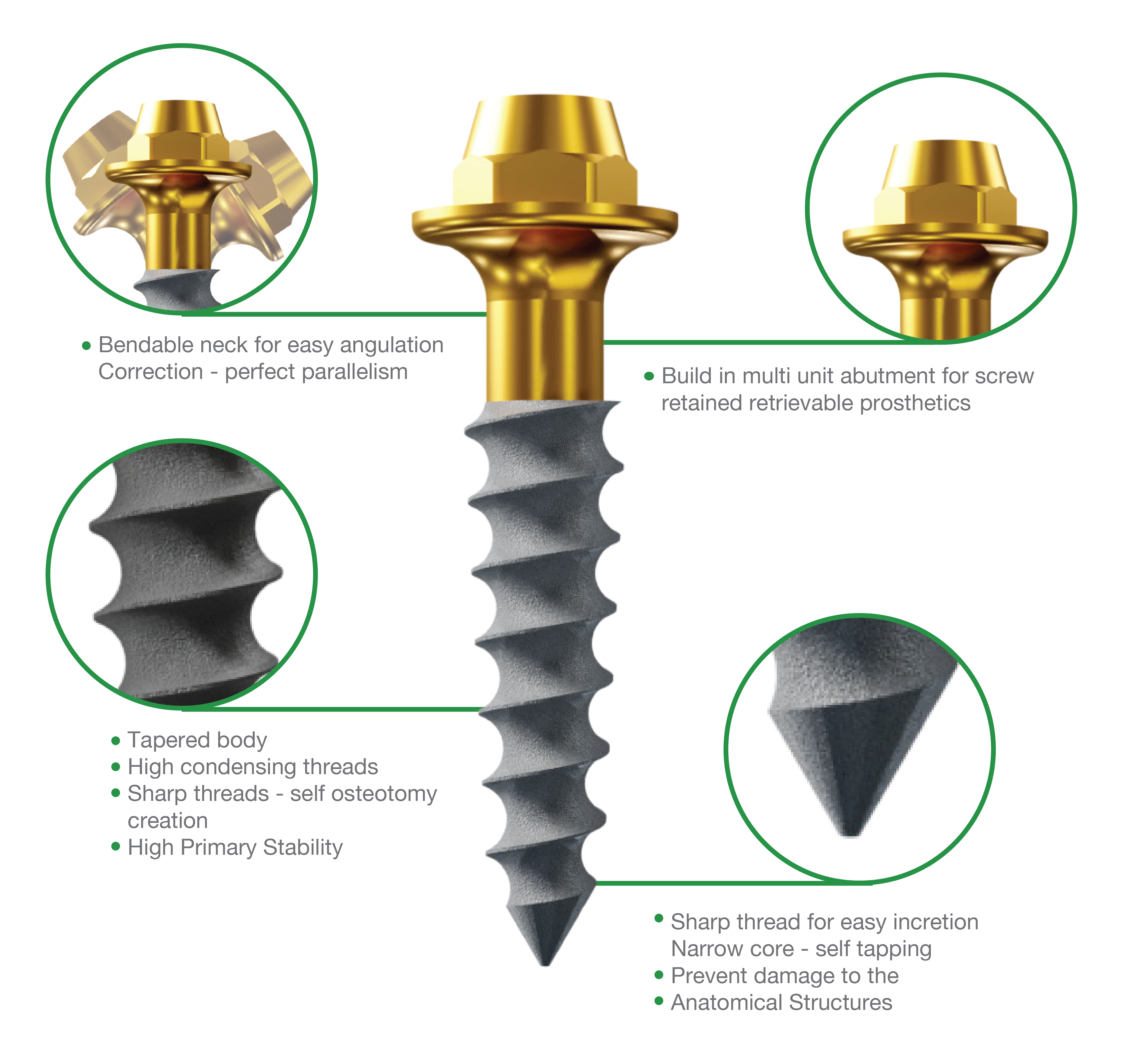 The MULTI-UNIT implant is a one-piece implant with multi-unit abutment for screw-retained restorations with a compression thread like in compressive implants. MU implant is used for cement free multiple unit restorations with immediate loading in the upper and lower jaws with adequate bone tissue. It can be used in combination with Compressive MoNoFlex and Root form implants with multi-unit abutments and allows flap and flapless placement Abutment direction can be up to 30º° relative to the other implant axis, a very useful feature in limited space unparalleled clinical cases
