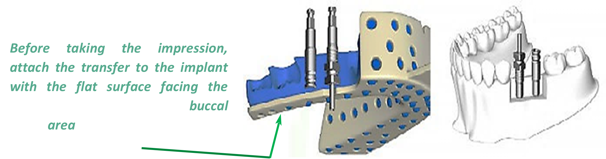• Open or closed implant impression transfers are used to demonstrate the position of an implant in relation to existing natural teeth and soft tissue contours.